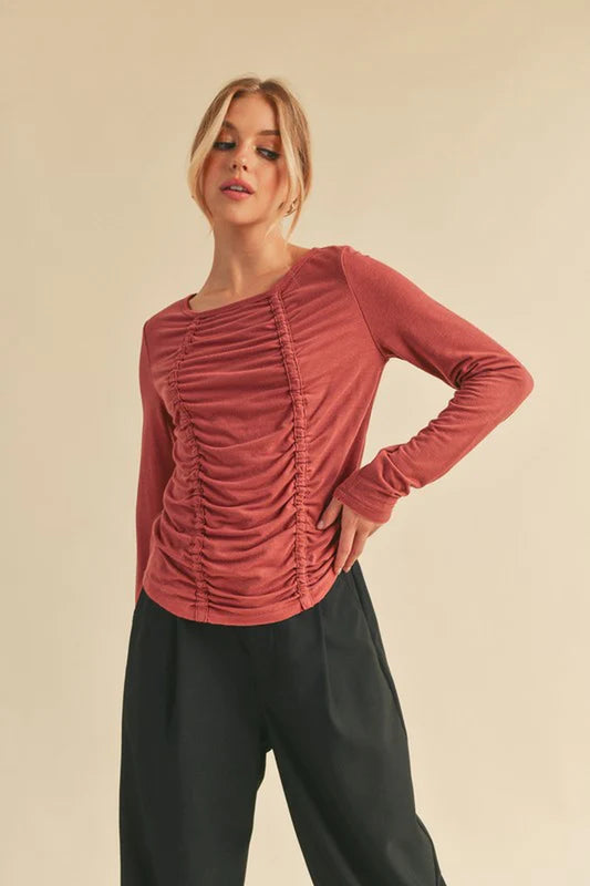 Aemi+Co Ruched Front round Neck Long Sleeve T-Shirt